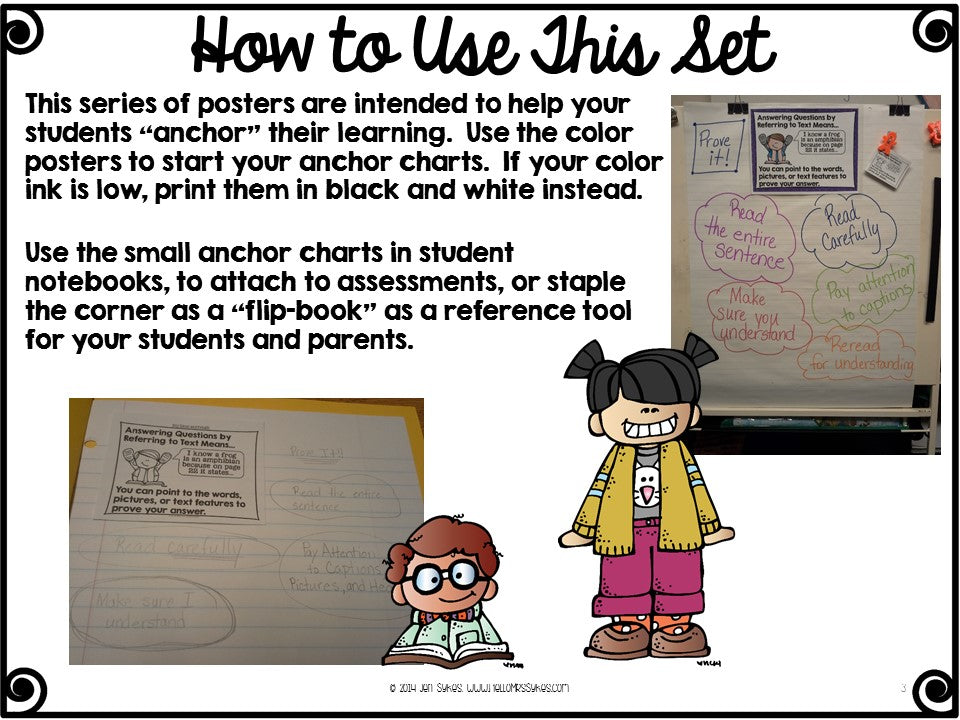 Students can glue the small anchor chart in their ELA notebook, and add their notes based on your class discussions, too. You can also attach the small anchor chart to assessments, or staple the corner to create a “flip-book” reference tool for students and parents.