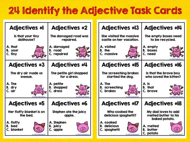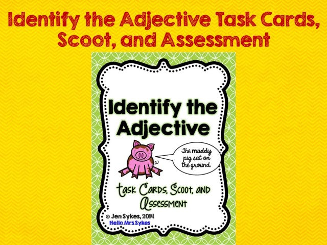 The 24 Identify the Adjective Task cards are great to have on hand as an extension activity for early finishers, an activity for multi-age or ability groups, as a review prior to standardized testing, or to play Scoot. Use the included "Scoot" sheet to assess knowledge of adjective identification quickly. The Identify the Adjective Practice Sheet can be used as a pre or post assessment. All answer keys provided.