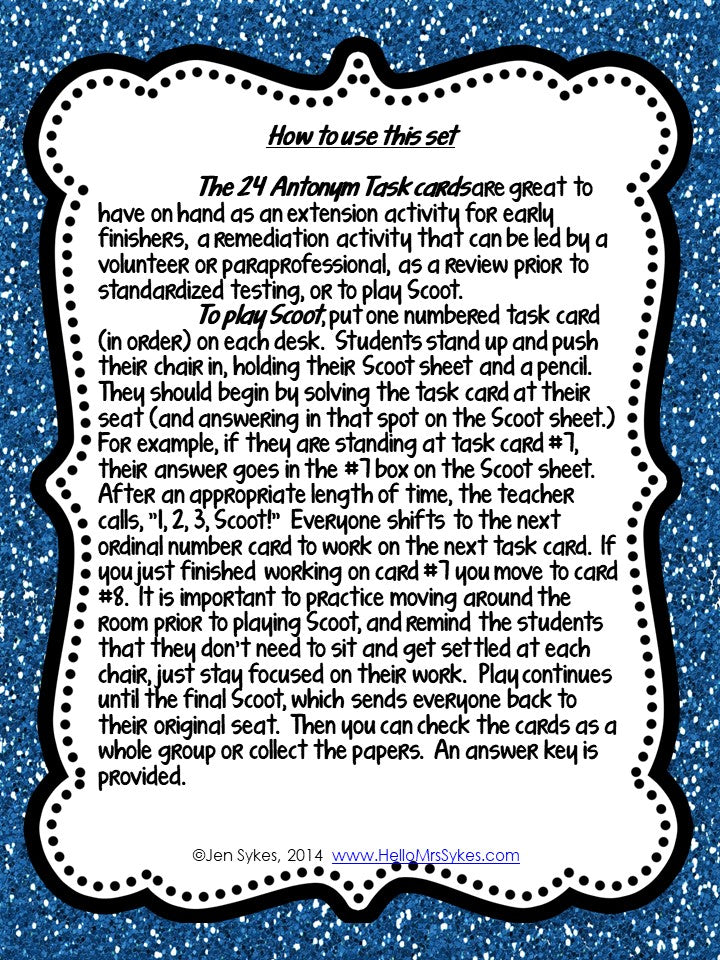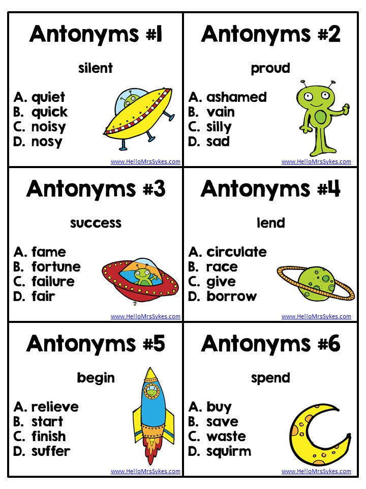 The 24 Out of the World Antonyms Task cards are great to have on hand as an extension activity for early finishers, a remediation activity that can be led by a volunteer or paraprofessional, as a review prior to standardized testing, or to play Scoot. You can use the included space-themed "Scoot" sheet to assess knowledge of Antonyms quickly. The Antonyms Practice Sheet can be used as a pre or post assessment. Answer keys provided.