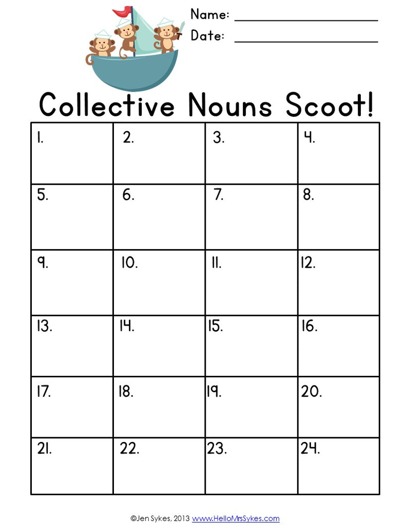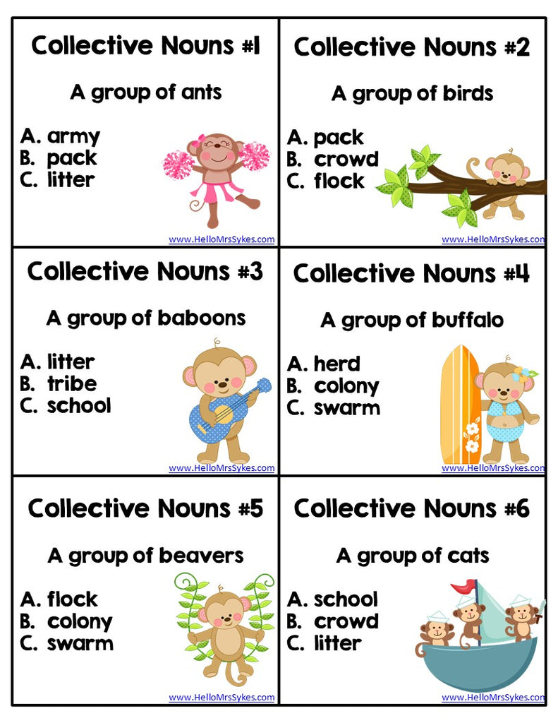 Project the colorful cards for whole group instruction, or use the printer-friendly version to save your ink. Use the included "Scoot" sheet to assess knowledge of Collective Nouns quickly. The Collective Nouns Practice Sheet can be used as a pre or post assessment. All answer keys provided.