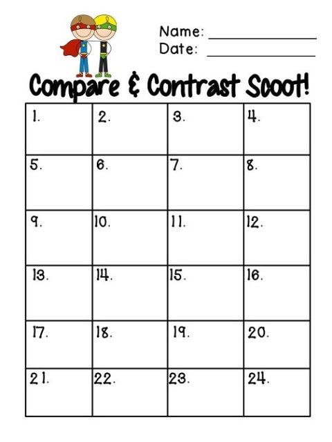 The 24 Compare and Contrast Task cards (12 fiction, 12 non-fiction) are great to have on hand as an extension activity for early finishers, a remediation activity that can be led by a volunteer or paraprofessional, as a review prior to standardized testing, and to play Scoot. Project the task cards for small group/whole group practice or mini-lessons. Use the included superhero-themed "Scoot" sheet to assess knowledge of Compare/Contrast skills quickly. The Compare and Contrast Practice Sheet can be used as a pre- or post assessment. All answer keys provided. Color and Black/White versions included. Check out the preview here!
