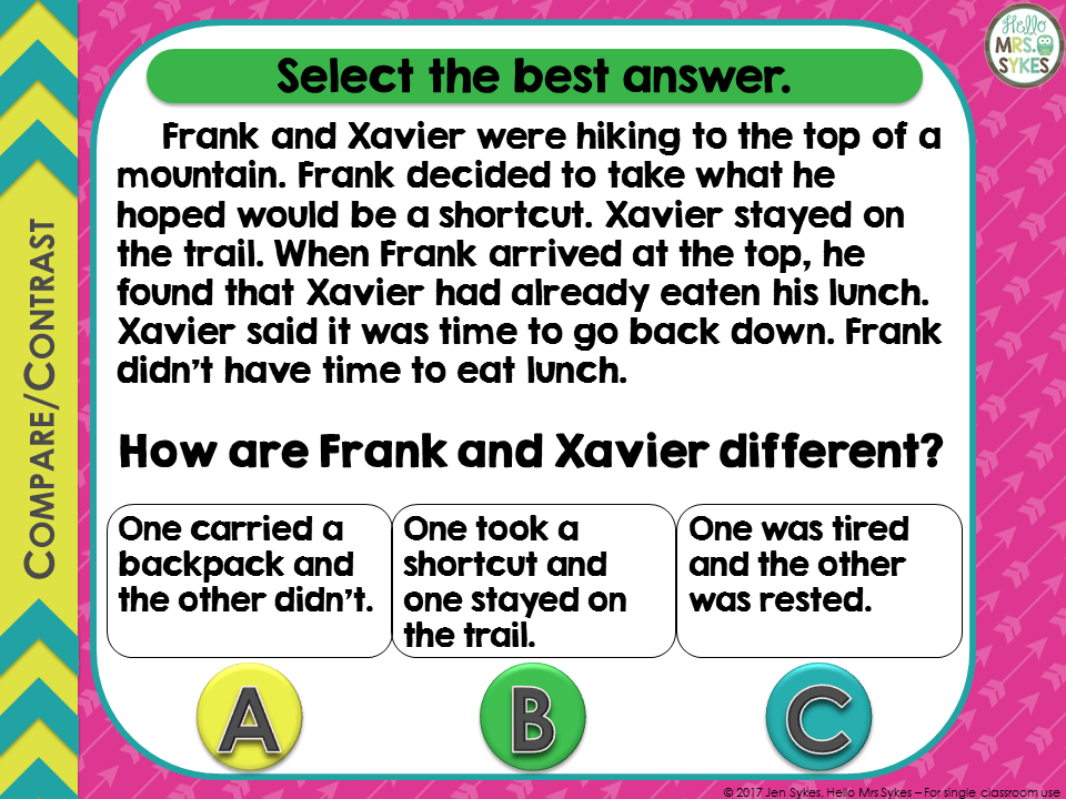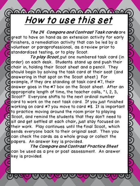 These materials are classroom-tested; to try a sample set of task cards, please download the preview. Please contact me with any questions! Want more Compare and Contrast Task Cards? Check out set #2: Compare and Contrast - Task Cards, Scoot, Assessment
