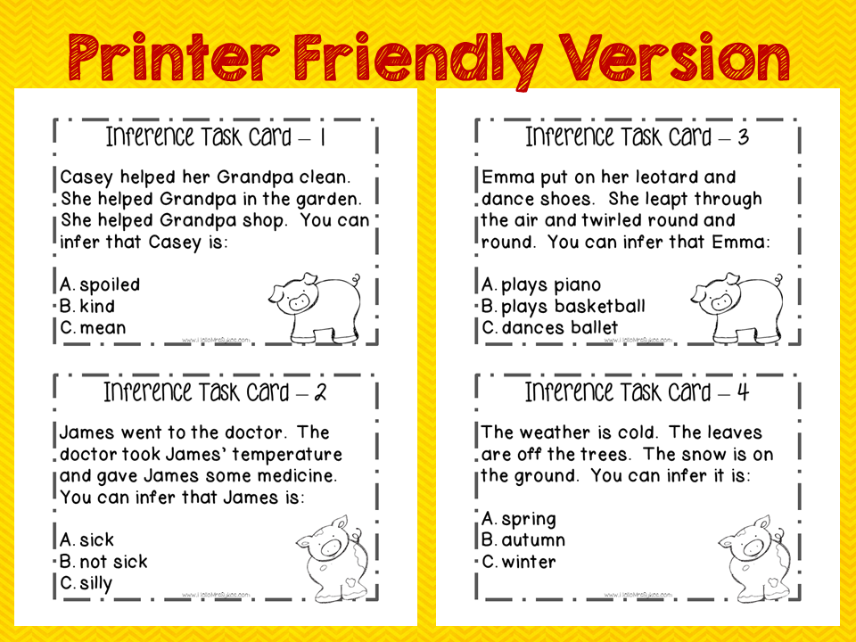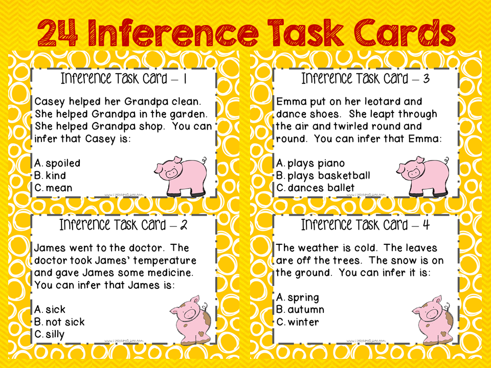 If you are teaching inferring, this set of 24 Inference task cards are going to give your students valuable practice. Students make inferences using the Tier 2 vocabulary that is embedded in the task cards. These are great to have on hand as an extension activity for early finishers, a remediation activity led by a volunteer or paraprofessional, as a review prior to standardized testing, or to play Scoot. Task cards can be projected for whole group discussion or a mini-lesson.