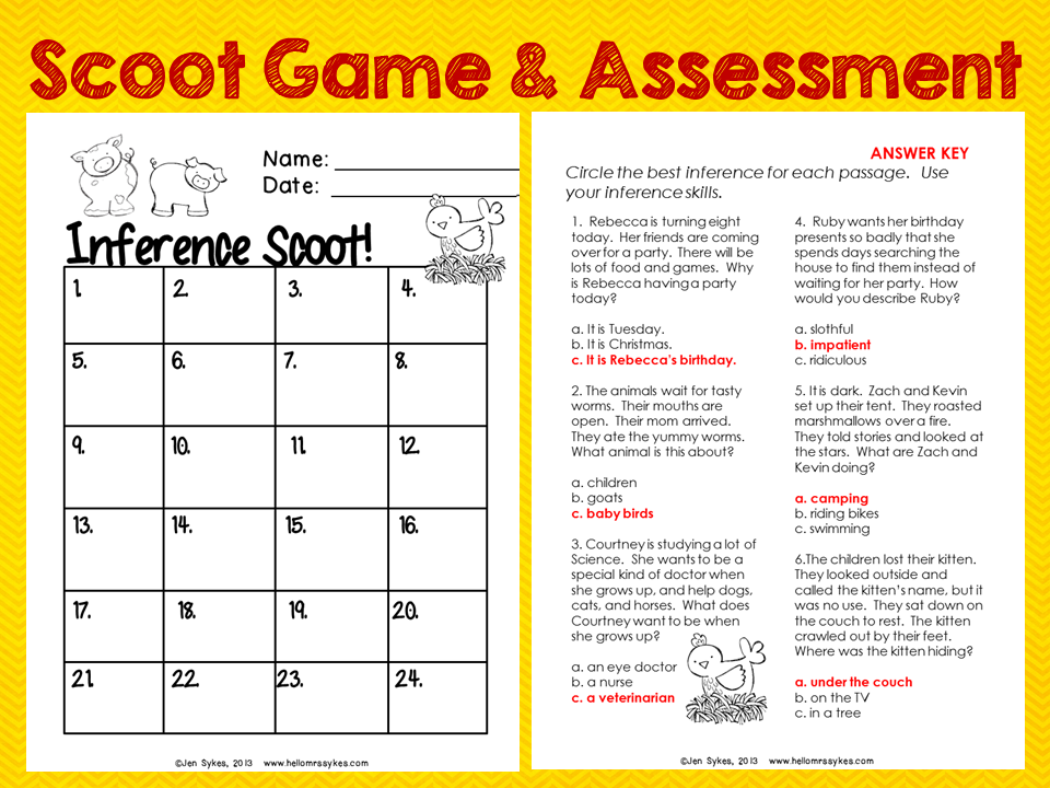 Use the included farm-themed "Scoot" sheet to assess knowledge of inferring quickly. The Inference Practice Sheet can be used as a pre or post assessment. All answer keys provided. Color and Black/White versions included. These materials are classroom-tested; to try a sample set of task cards, please download the preview. Please contact me with any questions!
