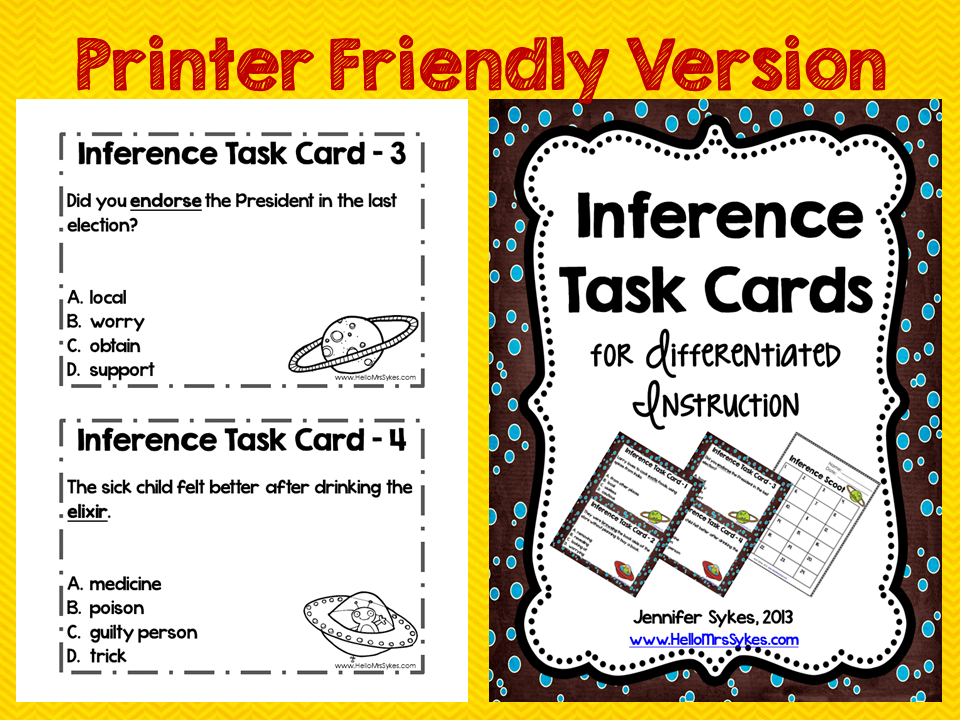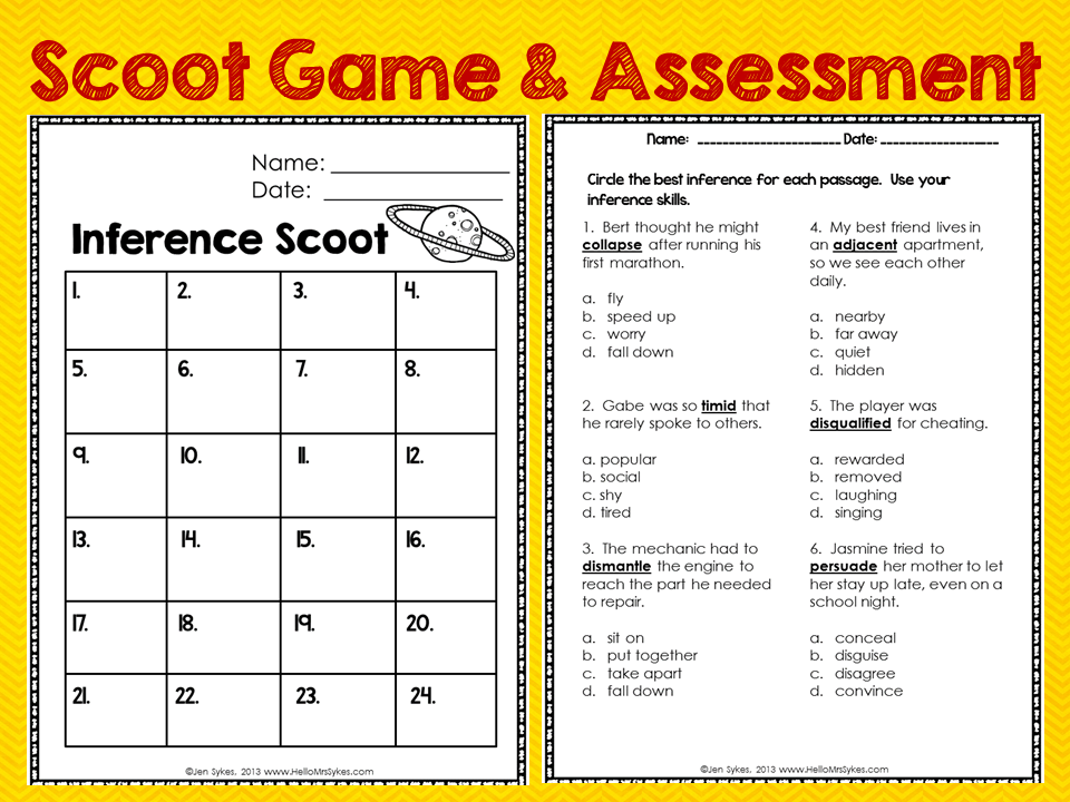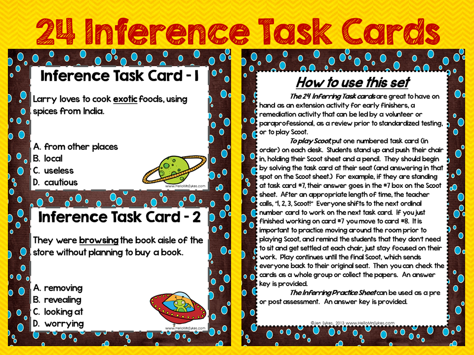 The 24 Inference Task cards are great to have on hand as an extension activity for early finishers, a remediation activity that can be led by a volunteer or paraprofessional, as a review prior to standardized testing, or to play Scoot. You can use the included space-themed "Scoot" sheet to assess knowledge of Inferences quickly. The Inference Practice Sheet can be used as a pre or post assessment. All answer keys provided. Color and Black/White versions included. Check out the preview here!