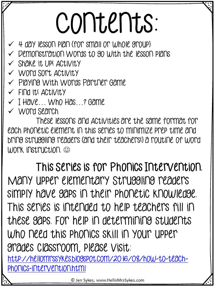 These lessons and Activities are the same format for each phonetic element in this series to minimize prep time and bring struggling readers (and their teachers!) a routine of word work instruction. Please visit my store again in the future, as I will be adding additional Phonics Interventions targeted at grades 3-5. For more information on how to help struggling readers in your classroom, please visit my blog series on this topic: Supporting Struggling Readers in Grades 3-5.