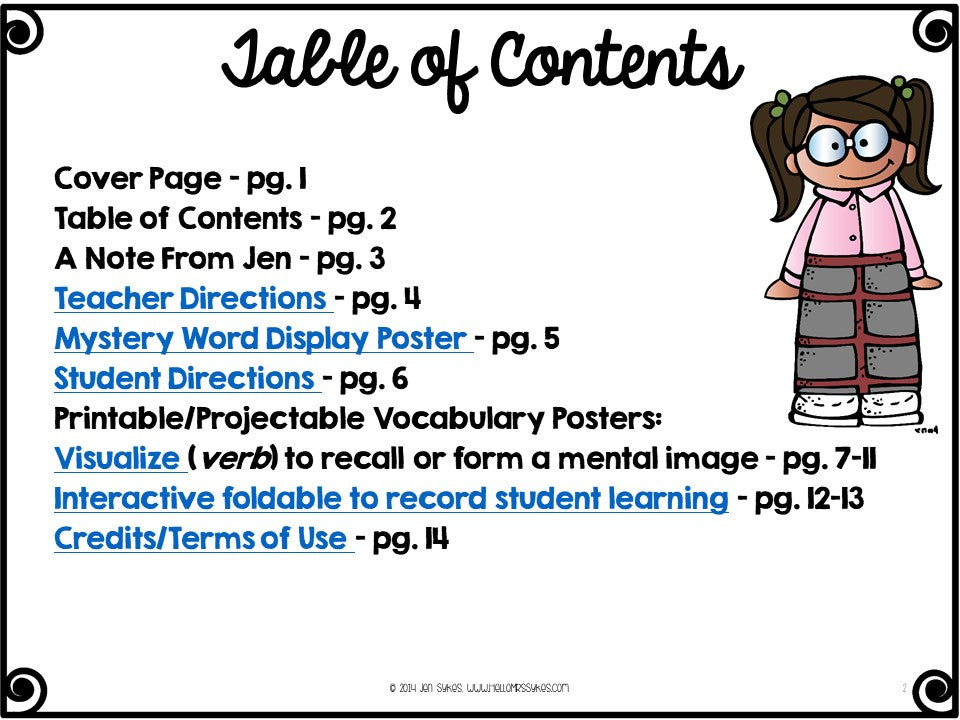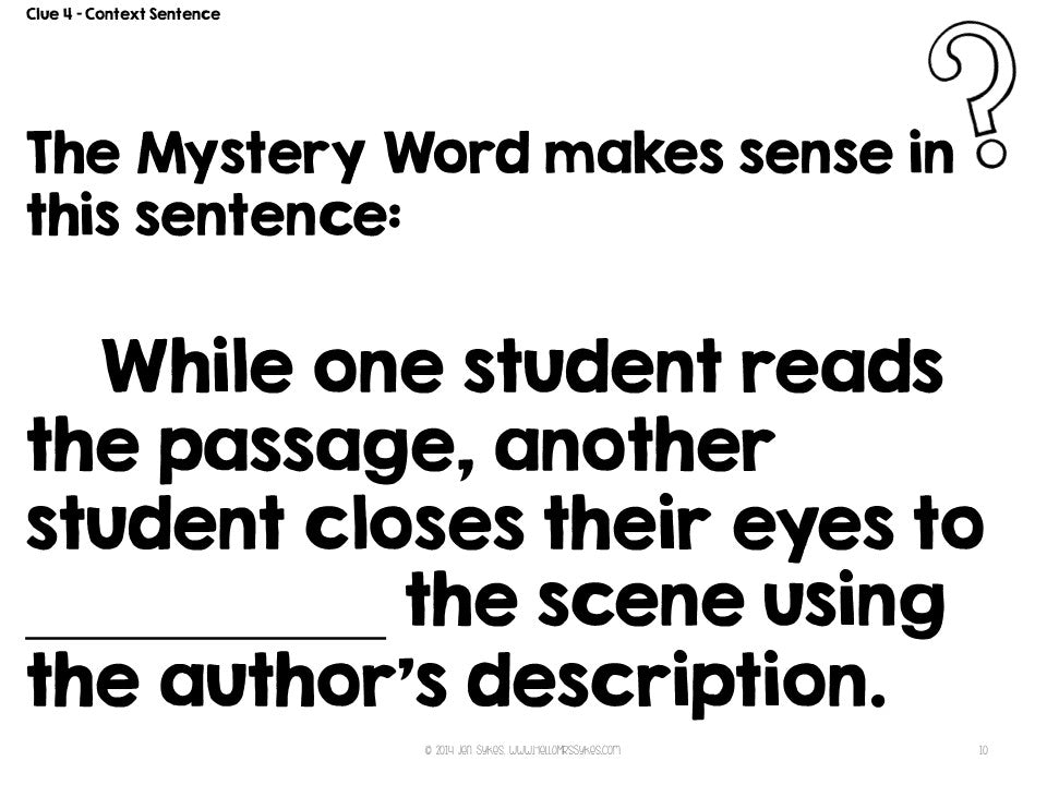 Each Vocabulary Word of the Week has daily clue posters and the "answer" poster for Fridays. Daily clues include synonyms, antonyms, using the word in a sentence, and describing the number of letters/beginning letter. Create an interactive bulletin board, post the Mystery Word of the Week as a challenge, incorporate the clue in your morning meeting, or include this in your Work on Words during Daily 5.