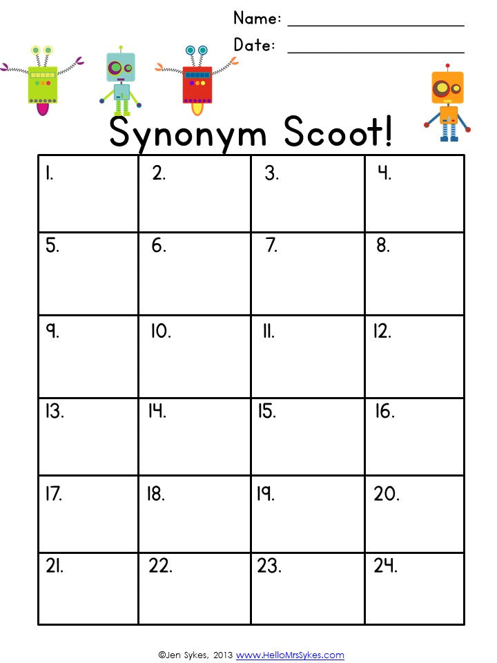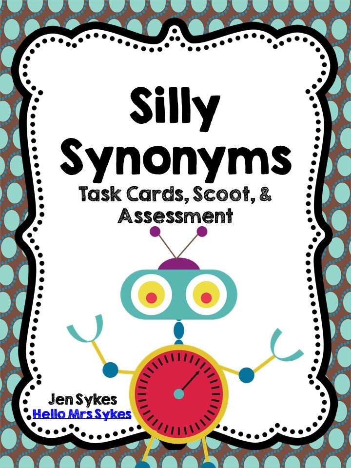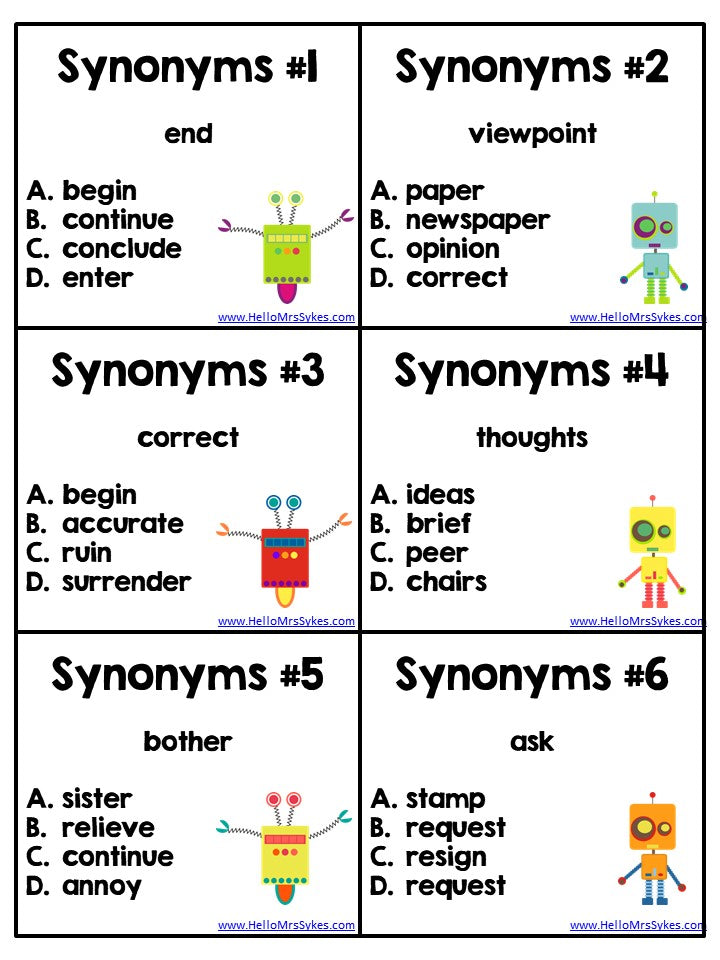 Use this packet to save you time as you differentiate instruction! The 24 Synonyms task cards are great to have on hand as an extension activity for early finishers, a remediation activity that can be led by a volunteer or paraprofessional, as a review prior to standardized testing, or to play Scoot. You can use the included robot-themed "Scoot" sheet to assess knowledge of Synonyms quickly. The Synonyms Practice Sheet can be used as a pre or post assessment. Answer keys provided. Download the preview for 6 free task cards, and a closer look at what is included!