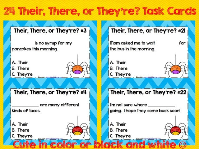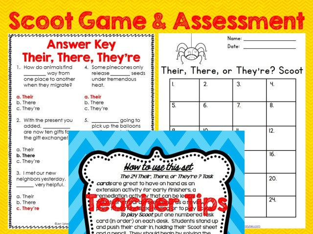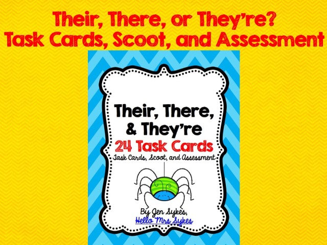 The 24 Their, There, or There? homophones task cards are great to have on hand as an extension activity for early finishers, a remediation activity that can be led by a volunteer or paraprofessional, as a review prior to standardized testing, or to play Scoot. You can use the included detective-themed "Scoot" sheet to assess knowledge of correct usage for Their, There, or There quickly. The Practice Sheet can be used as a pre or post assessment. Answer keys provided. Check out the preview here!